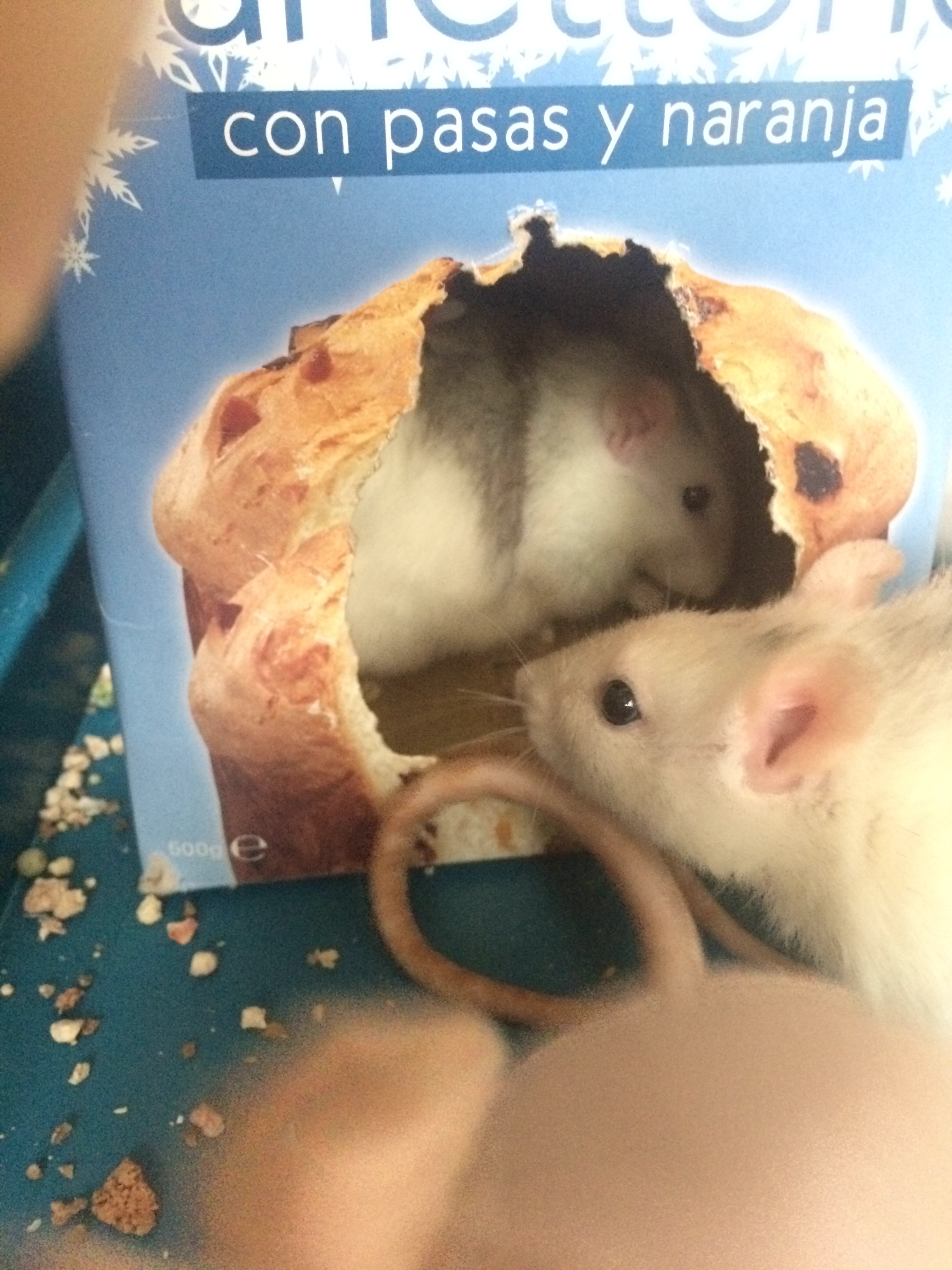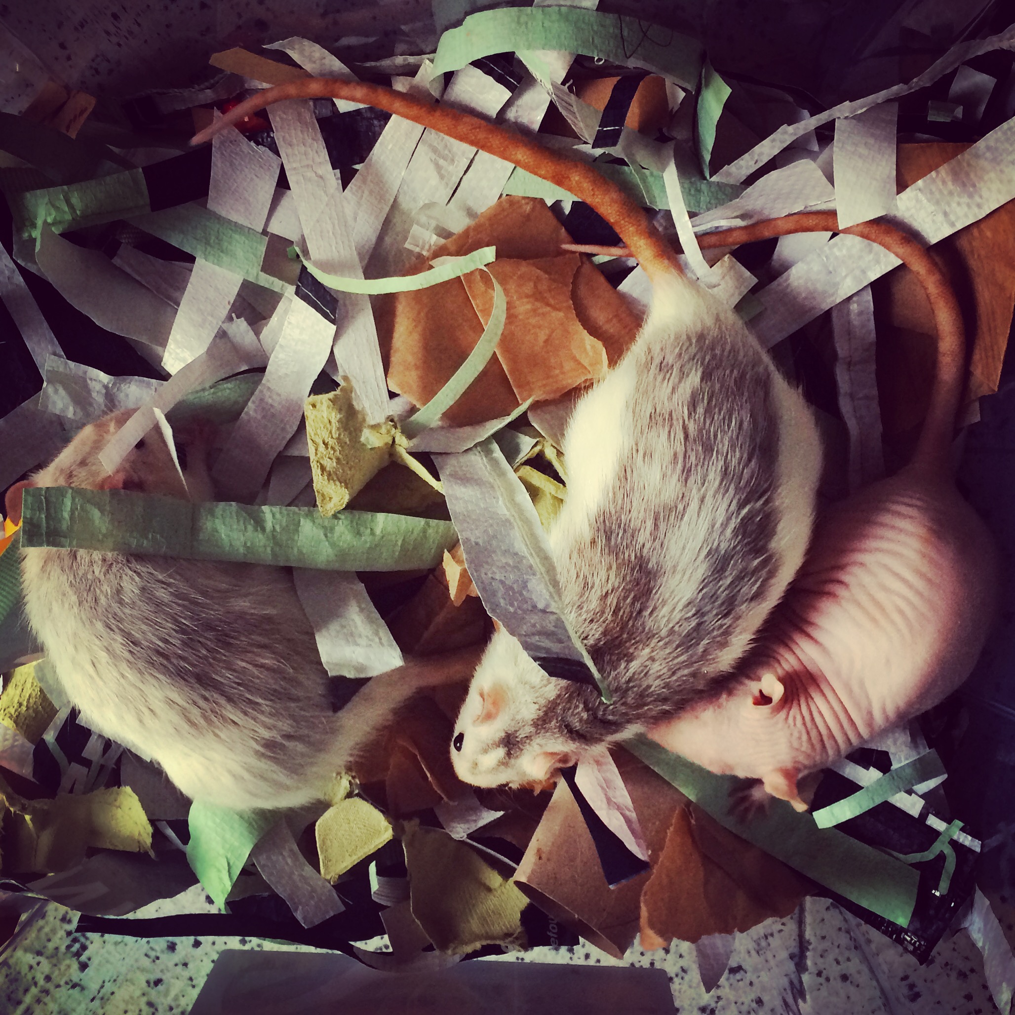 Rats love boxes. And, contrary to what I thought, won’t gnaw through them. They love making nests, although it really depends on their character. Only one of ours is nest-obsessed: Kim, the naked rat (she has no fur!)
