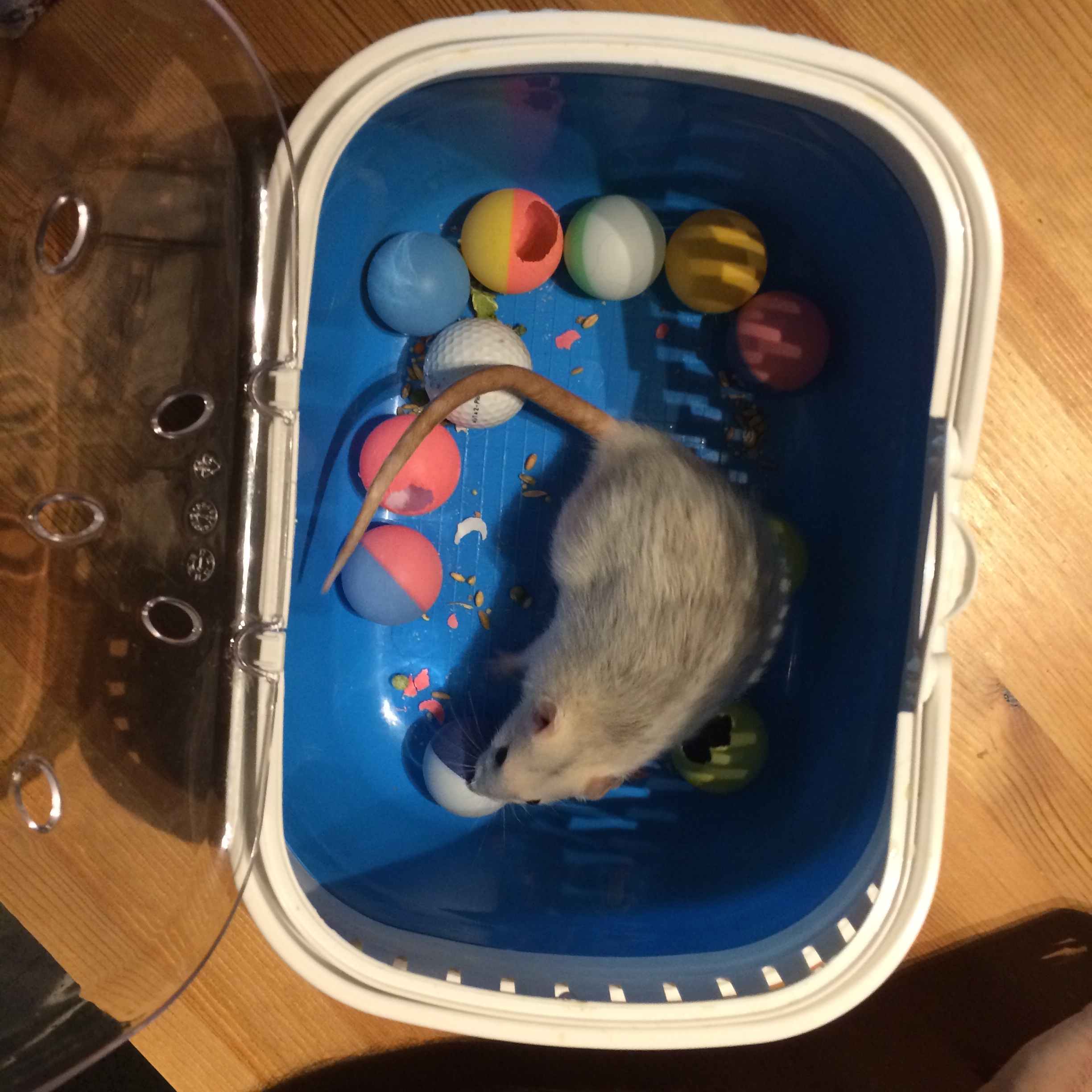 Rats love pingpong balls. I suspect it’s because they remind them of nuts and they think there’s something inside…who knows what they’re thinking though! The good thing is that they like them even when they’ve made a hole, which is after about ten minutes. Oh, and rats are definitely not stupid – they won’t eat plastic or paper or wood. Just munch