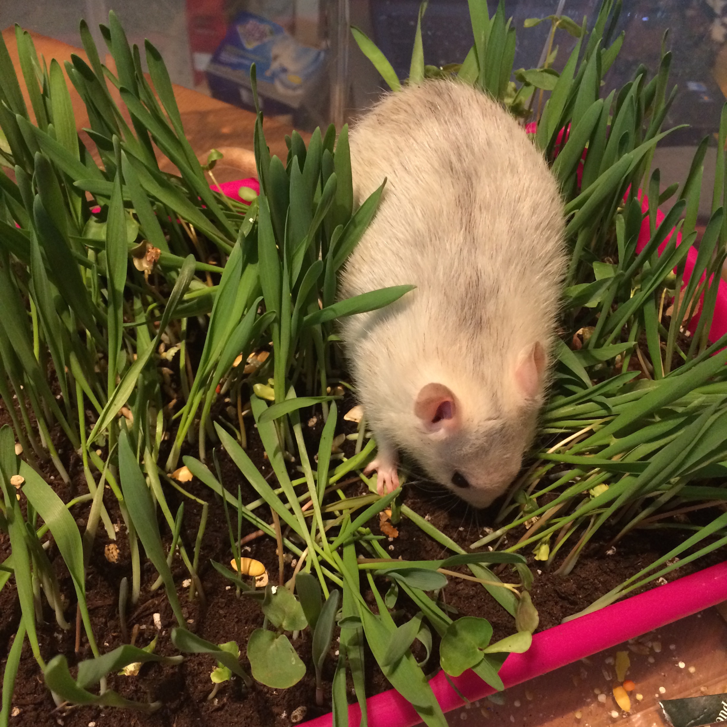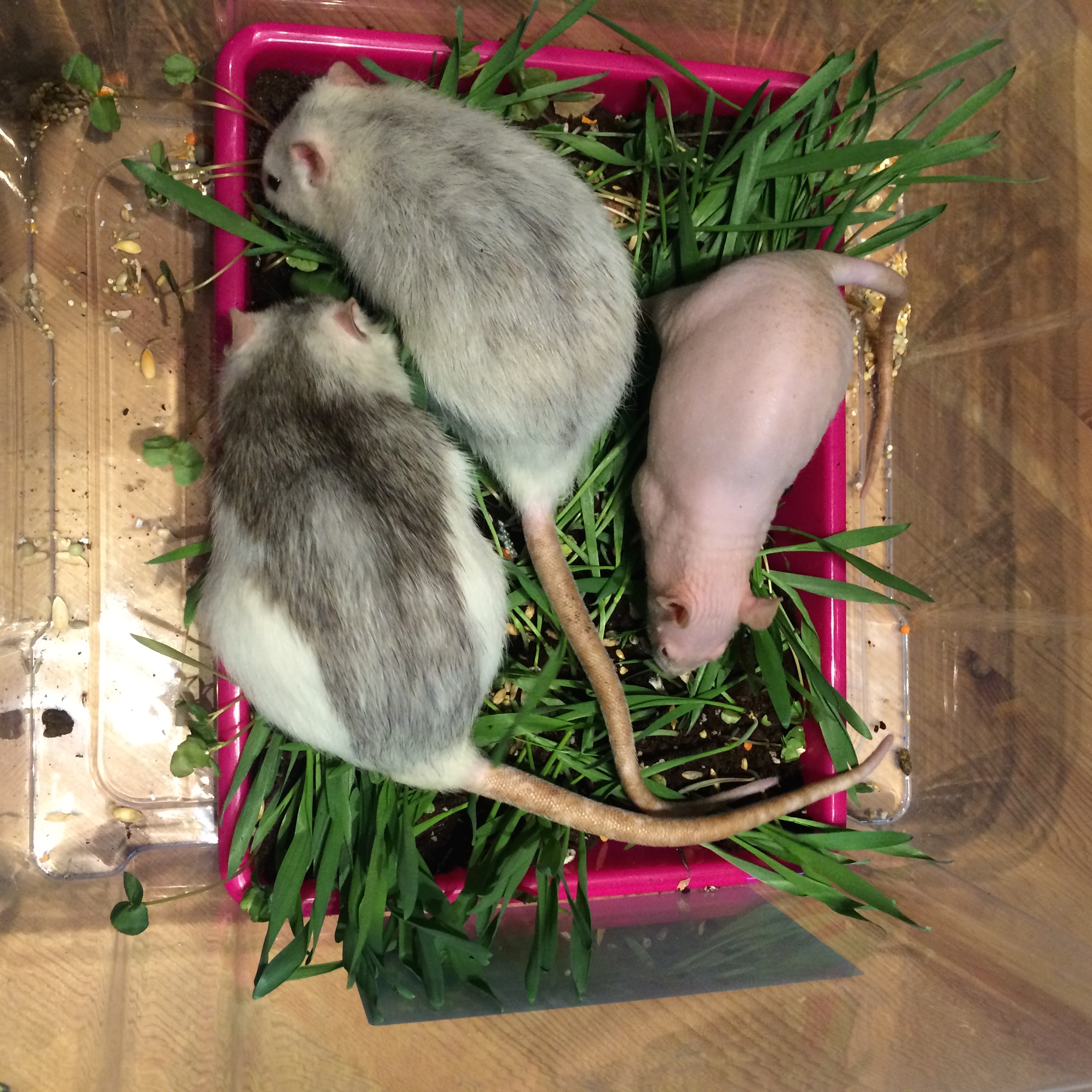 Rats love digging. This is their first digging box, with shreds of paper. I threw some treats and seeds in, so they’d have something to look for. It took a few days but then they got used to it and had loads of fun tunnelling under the debris!