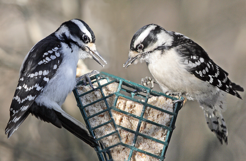The smallest woodpecker in North America, Picoides pubescens is black and white only when it’s a female. Males actually have a tiny red spot on the tops of their heads. I thought I’d mention that, for clarity. The Downy woodpecker is virtually identical to the Hairy Woodpecker (Picoides villosus), with the only visual differences being size, length of tail and some extra black feathers on the tail, but genetically they’re completely different: even classified in distinct genera. An incredible example of convergent evolution, in which two fairly different animals turn out to be very, very alike!
