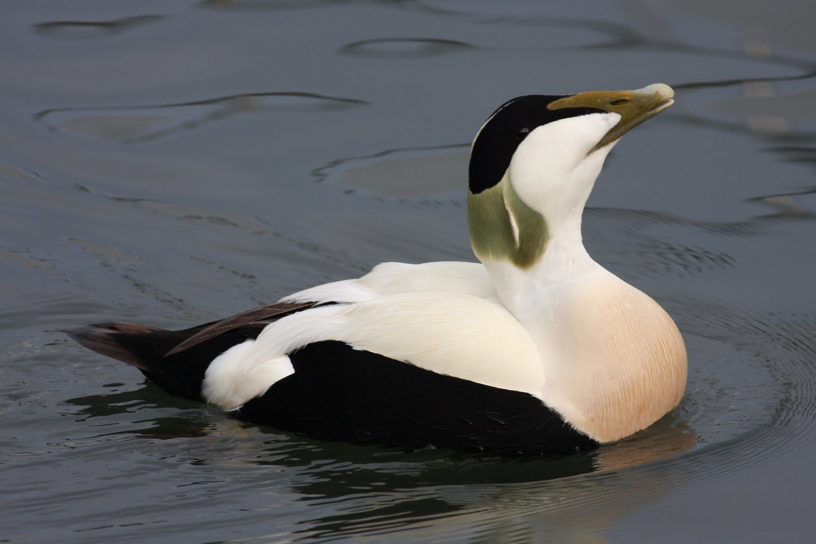 This cutie pie (Somateria mollissima) is a northern sea-duck that migrates to warmer climates in huge flocks during the winter. Female eiders tend to go back to their birth site to nest, and this creates a high degree of relatedness in the colonies and consequent kin-based behaviours between the females that frequently lay their eggs in each other’s nests and rear the young in creches.